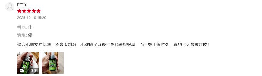 適合小朋友的氣味,不會太刺激。小孩噴了以後不會吵著說很臭,而且效用很持久,真的不太會被叮咬!