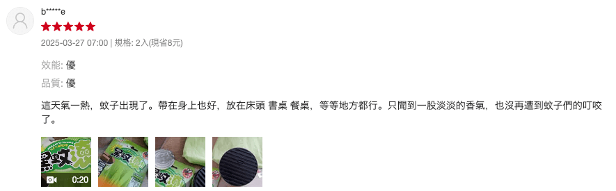 防蚊效果很不錯,但不殺蟲,只是驅趕蚊子不敢靠近,所以偶爾會有1、2隻蚊子靠近,但已經減少...